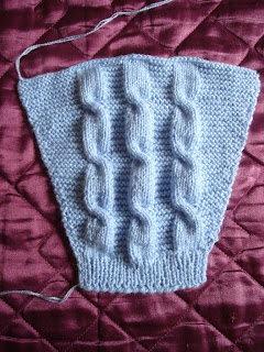 Colocar na agulha 34 pts, trabalhar em ponto barra por 5 cm, aumentar 1 ponto em cada lado da primeira carreira.